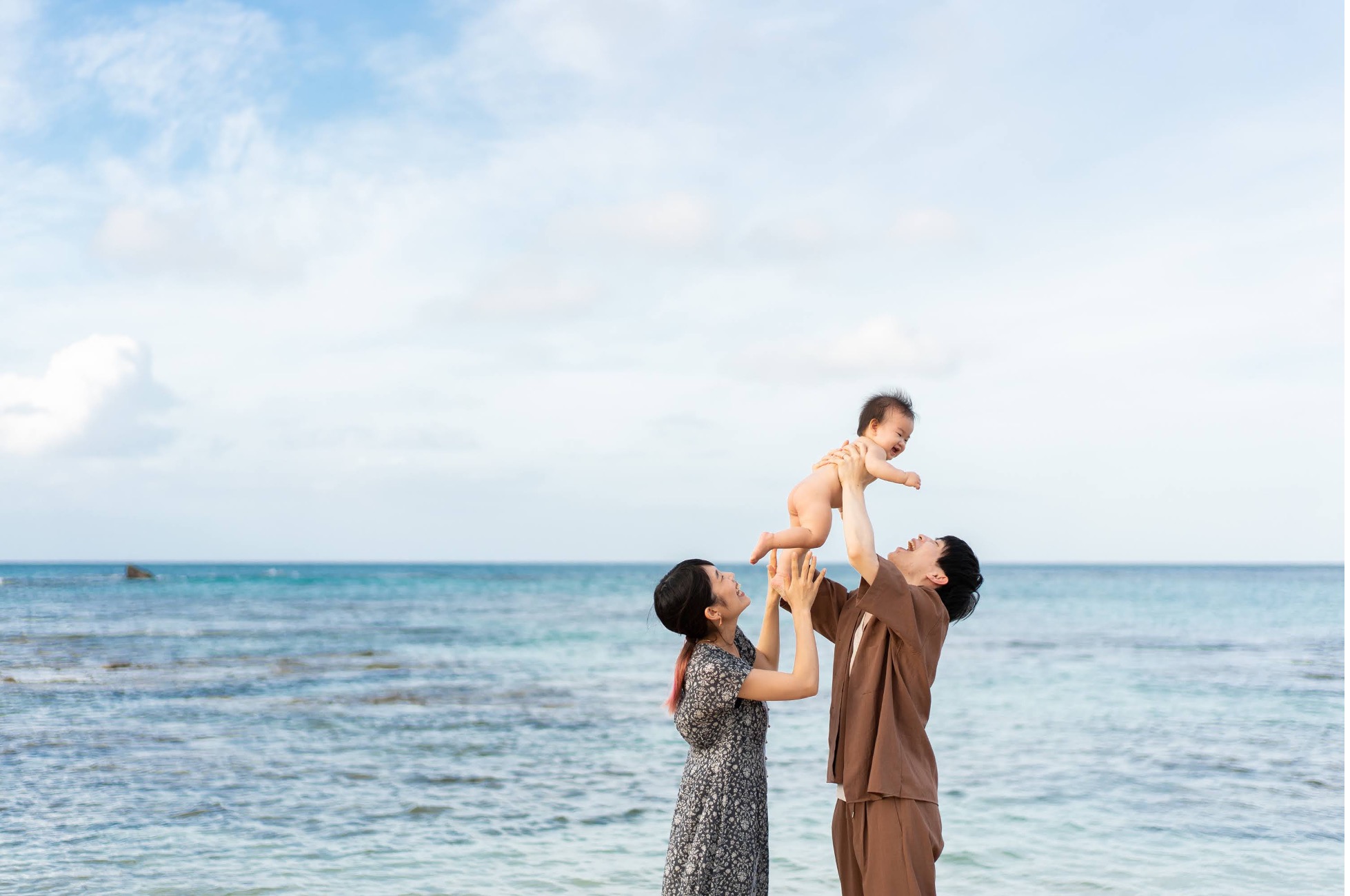 妻と筆者と長女。奄美大島の周りには透き通った瑠璃色の海が広がる=2021年7月