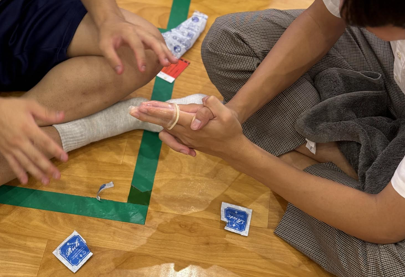2人1組になってコンドームを装着する練習をする生徒=2024年5月