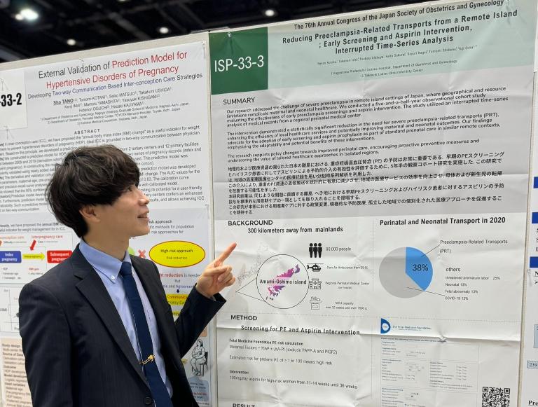 育休が明けた直後の4月、横浜市で開かれた第76回日本産婦人科学会学術講演会に参加しました。学術講演では、「妊娠高血圧腎症のスクリーニング、バイアスピリンの投与が島外搬送を減らす」というテーマで、3年近くかけてデータを集めた妊婦と胎児のリスク管理に関する研究結果を、初めて英語でプレゼンしてきました。