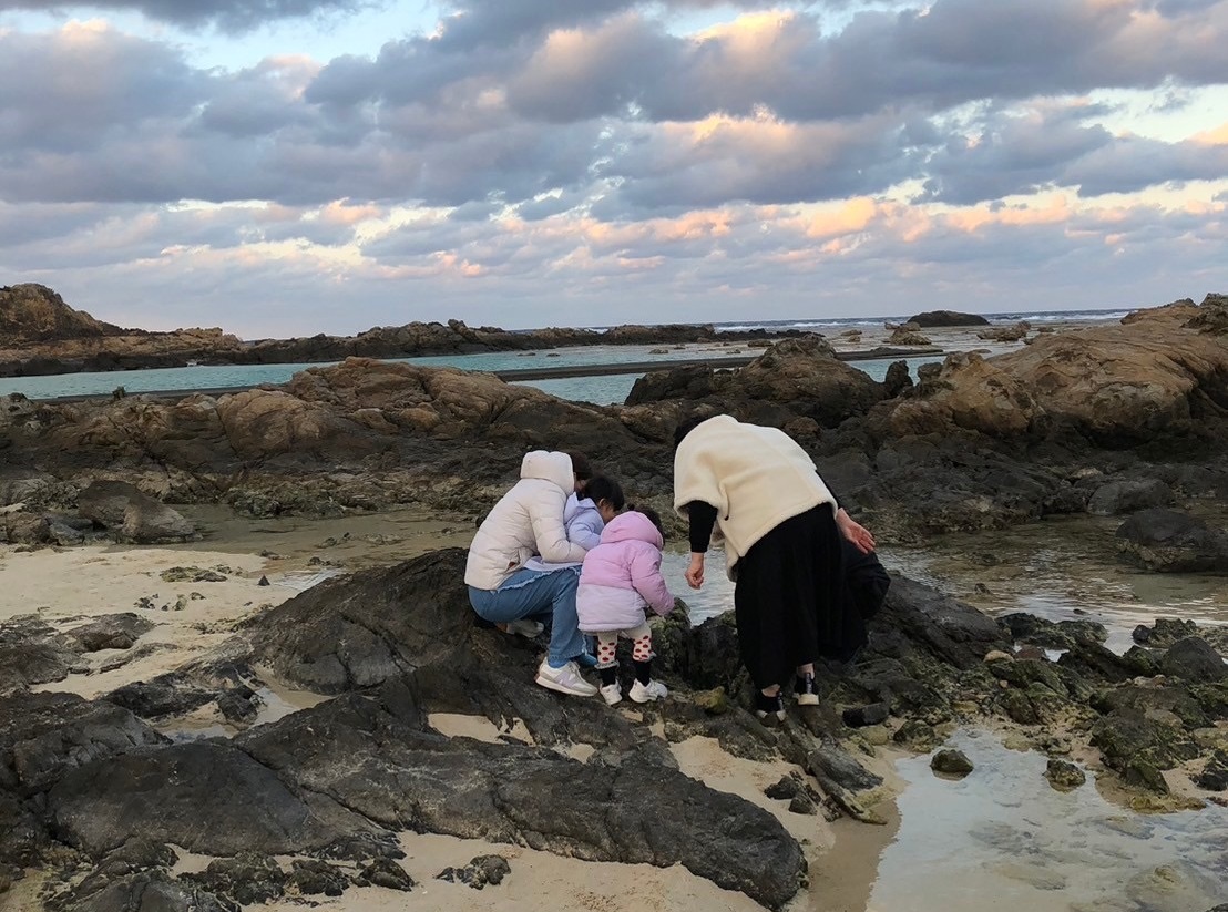海の生き物を探し中。ばあば(右)が一番熱心だったかも?=奄美大島の海岸で25年の初め