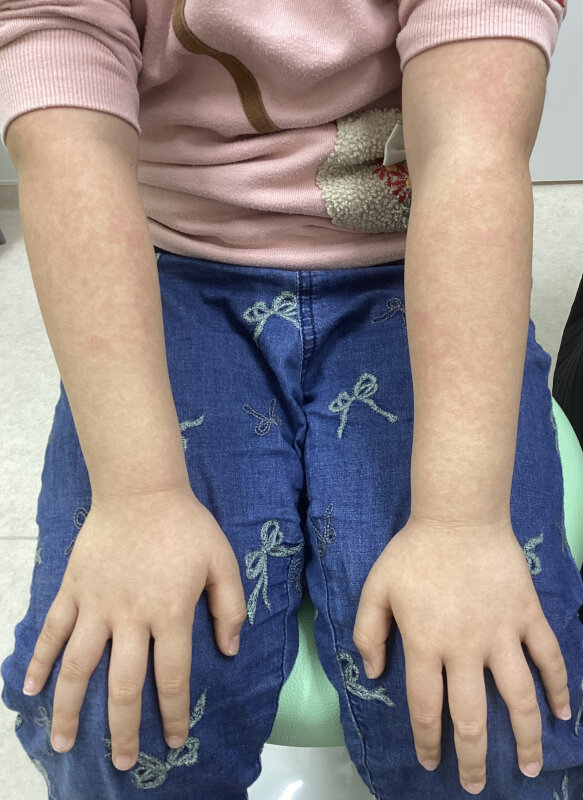 ある日、典型的なリンゴ病の皮疹を呈した患者さんが来ました。冒頭で紹介した患者さんとは違う人です。皮疹に加え、高熱、強い倦怠(けんたい)感、激しいせきと鼻水の症状も出ていました。