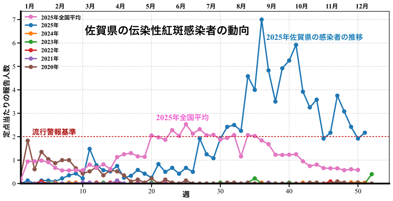 ところが、その「空白期間」の反動が昨年一気に表面化し、かなりの勢いで伝染しています。全国平均を見ると落ち着きつつあるようにも見えますが、佐賀県、特に私がいる武雄杵島地区(武雄市を含む1市3町)では、12月に入っても警報レベルを超えたままでした。