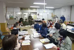 一本道を登りきった丘の上の広い平地に、出島集会所の建物があり、この中に出張診療所のスペースが設けられている。集会所の対面には、災害公営住宅が建売住宅の住宅地のようにして佇んでいる。齋藤チームの到来を知った住民たちが、おしゃべりをしながら三々五々に集まってくる。