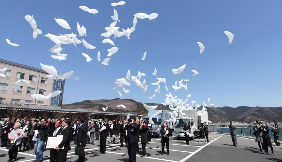 女川町地域医療センター開所式。祈りが届くことを願って、震災で亡くなった町民の数だけ、白鳩の風船を飛ばした。