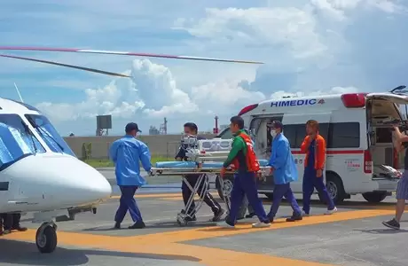 赤ちゃんを収容した保育器を、ストレッチャーに乗せてドクターヘリに搭載