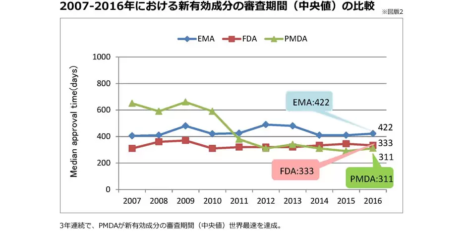 抜擢が的を射ていたことは、たとえば新薬の審査機関の短縮で見ることができる。1990年代にドラッグラグ(=日本は新薬の承認に時間がかかりすぎる)をなんとかしてくれと、新薬を欲する多くの患者さんから悲鳴のあがっていた問題だ。アメリカのFDA、ヨーロッパのEMAと比較した時、絶望的に長かった審査期間を、新理事長は瞬く間に短縮し、現在では見事に凌駕する水準におしあげて見せた。【図版2/2007-2016年における新有効成分の審査期間(中央値)の比較】